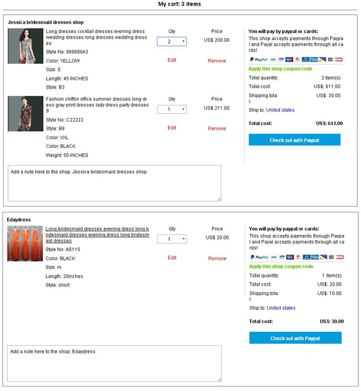 When all the items you want in the cart and write the notes/requirements on the related comment box if any, then you can click the blue button "Check out with paypal", by clicking this checkout button, the order will be placed and go to page as below:
