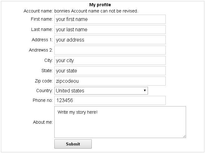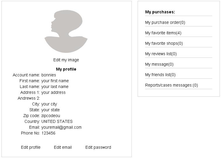 My profile includes three parts: 1, my image, 2,Names/address, 3,edit profile/email/password.