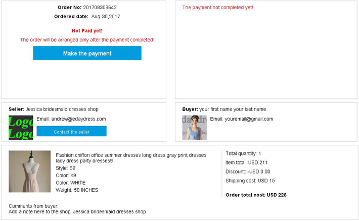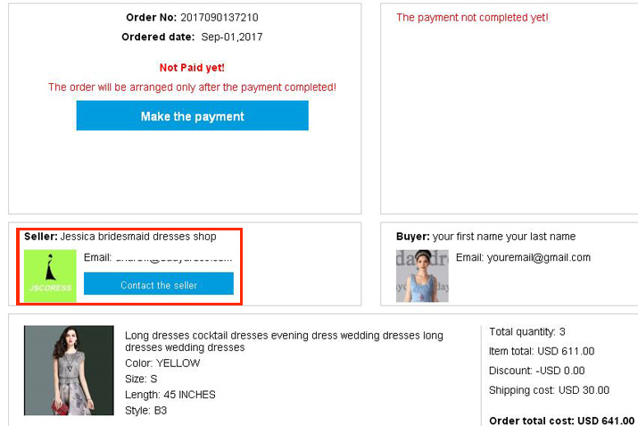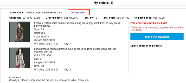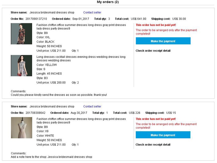 On this page, you can view all your orders summary as well as the payment status and shipping stutus, If the order was not paid yet, the seller will not arrange the order and the order will be only arranged after the payment completed, so click the blue button "Make the payment" to complete the payment.