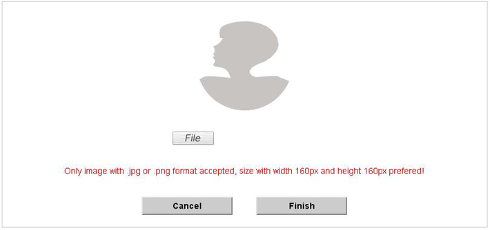 Click "file" button to select an image of you from your computer/cellphone, after seleted the image to upload, then click the button "Finish" which will be done!