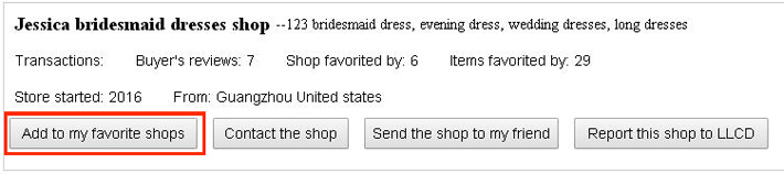 When reviewing some items you are insterested and you want to buy the items later, or you are interested in some stores, then you can add the store to my favorites shops. To add the shop to my favorites shops, please click the button "Add to my favorite shops" on the left top of the store site page.