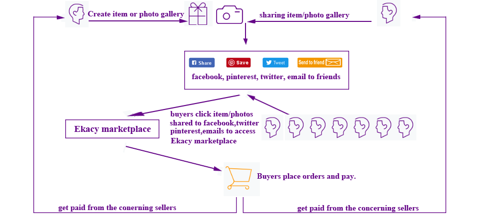 Listing items to sell, after someone sharing any of your listed items to their facebook, twitter, pinterest or email to friends, a buyer click the shared link to access Ekacy marketplace to see the shared item, then if the buyer place an order or orders and complete the payment for the shared item, or ANY ITEM or ANY ITEMS from any shops(YES, you are right! it is ANY ITEM, ANY ITEMS FROM ANY SHOPS, NOT ONLY THE SHARED ITEM) on Ekacy marketplace, you will get paid, a certain percentage of commission will be credited into your account.