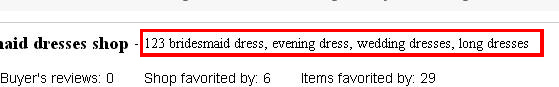 **Shop keywords: This is very important for buyers' searching, well set this keywords will have much more chance to appear at the top of searching results when buyer searching the product by entering the keywords on llcd marketplace or some other searching engine such as google, yahoo, bing etc. So please kindly use keyword closest to the items you are selling. For example, if you are selling bridesmaid dresses, then you case use some keywords such as: white bridesmaid dresses, long bridesmaid dresses, short bridesmaid dresses, chiffon bridesmaid dresses, but plesae do not repeat the keywords, like using the same keywords: long bridesmaid dresses, long bridesmaid dresses, long bridesmaid dresses, which is wrong and not good for searching.