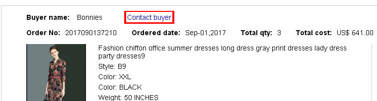 Clicking "My seling order" to see the order summary list where you will find each of the order with the order payment status, qty, shipping status etc. and if you want contact the buyer for the order issues, you see that on the top of the order with blue letter "Contact buyer" as below: