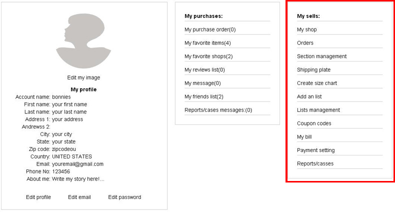 Payment setting: Payment setting, this is for adding the seller payment account for receiving buyers' payments. Currently, we only allow seller to use paypal account to receive the payment, so that seller must create a paypal account and add the paypal account on this page before selling.